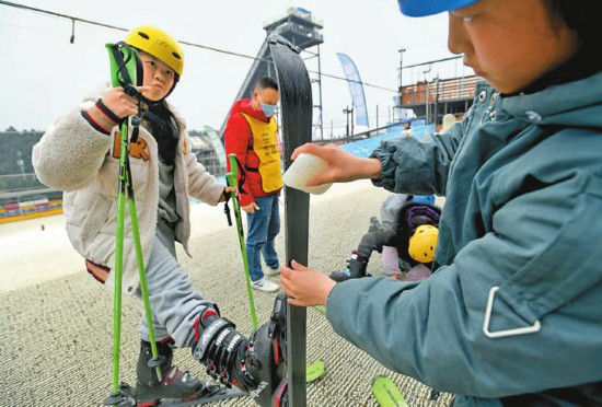9日下午4点,听障滑雪队的孩子们聚在尖锋旱雪场的休息区,一起听教练分析训练测试结果。“刚才曹教练说,今天测试中胡海涛的成绩比上一次提高了0.7秒,突破了10秒大关,是队里目前的最好成绩,要继续。”特教老师陈金梅的语速放得很慢,同时用手语比划着向围在身边的孩子们翻译教练点评。孩子们的掌声随即响起,都向胡海涛竖起了大拇指。